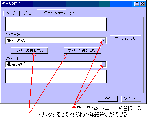 詳細な設定をするには、それぞれヘッダーの編集(C)、フッターの編集(U)をクリックして、表示されるダイアログボックスで行います。