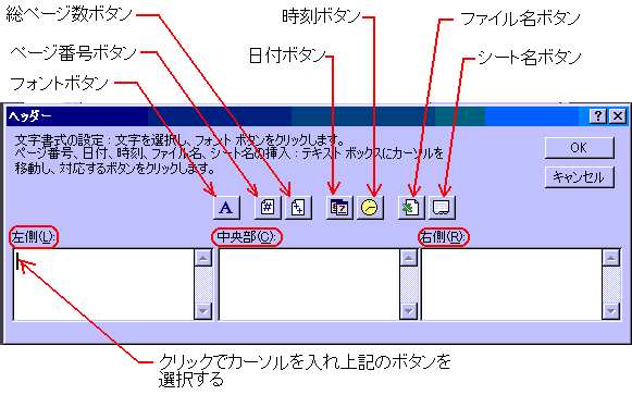 設定方法は、上図のとおりヘッダーの左側(L)、中央部(C)、右側(R)の位置を選び、カーソルを入れてから、挿入する項目のボタンをクリックします。フォントの変更は、フォントボタンをクリックして更に表示される「フォントの設定」ダイアログボックス(表示省略。確認してください)で行います。