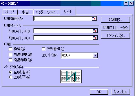 上図のダイアログボックスは、標準画面(ワークシート画面)のメニューバーからファイル(F)、ページ設定(U)をクリックして表示させたものです。印刷プレビューのページ設定(S)ボタンをクリックして表示されるものと少し異なっています。印刷プレビューを経由して呼び出すと印刷範囲、印刷タイトルなどが入力できないようになっています。また、印刷(P)、印刷プレビュー(W)ボタンも表示されません。
