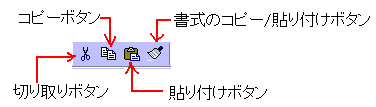 まず、コピー範囲を選択し、<書式のコピー/貼り付け>ボタンをクリックします。するとマウスポインタが、白抜きのプラス表示にこのボタンの絵柄が付いた形に変わります。次に貼り付けたい個所の先頭セルをクリックします。これで完了です。ダイアログボックスを使用して行う書式の貼り付けと全く同じ貼り付けが出来ます。 |