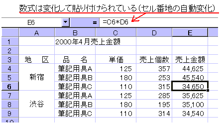 次に、このセルを他のセルにコピー(初級2)すると、数式は、セル参照が自動的に変化し売上金額が求められます。