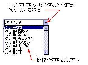 図のように、最初に「セルの値が」又は「数式が」のどちらかを選択します。(▼矢印をクリックし選ぶ)