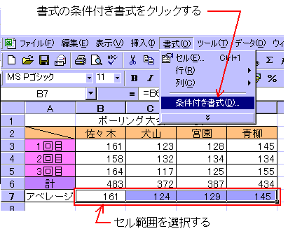 入力例は、下段の「条件付き書式の実例・その1」を参照。