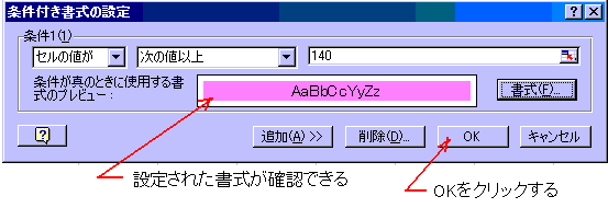 以上の条件設定が終わってから、ダイアログボックスの書式(F)をクリックします。クリックすると「書式設定」ダイアログボックスが表示されます。このボックスは「入門10」で述べた書式設定ダイアログボックスの簡易版のようなものです。「フォント」、「罫線」、「パターン」の設定ができるようになっています。実際に表示させ確かめてください。 |