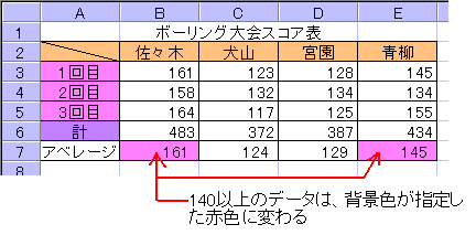 この例では、便宜上あらかじめデータが入力されているセルへ条件付き書式を使っていますが、本来は、データを入力する前に条件付き書式を設定しておきます。そうしておけば、入力データを判断して、書式が自動的に反映されます。 以上の例は、条件とする値を直接入力していますが、「セル参照」で入力することも出来ます。セル参照の場合、参照するセルをクリックするとボックスには自動的に「=」が入力され絶対参照の形式になります。実際にエクセル(Excel)を開き確かめて下さい。 |