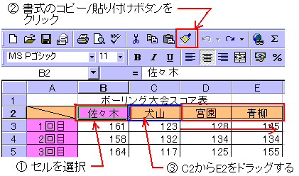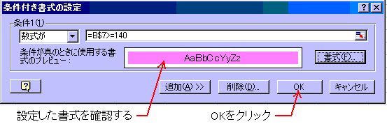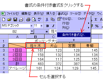 上記のコピー方法では、書式すべてがコピーされますが、条件付き書式のみコピーする方法もあります。条件付き書式が設定されているB2セルからE2セルまでを範囲指定し、書式メニューから条件付き書式をクリックします。するとダイアログボックスが表示されるので、OKをクリックします。