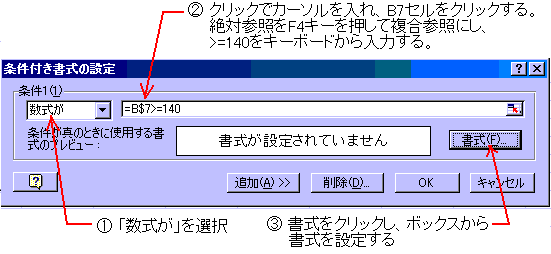 ここで解説した数式の入力は、条件付き書式をコピーするために、絶対参照のセル参照を複合参照(行を絶対、列を相対)に変更していますが、相対参照に変更してもかまいません。 数式ボックスに入れる数式は、「関数」を入れることも出来ます。「関数」を使う方法は、「中級編」を参照。 |