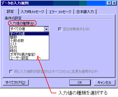 表示されたダイアログボックスで、設定タブを選択し、まず、入力値の種類を決めます。