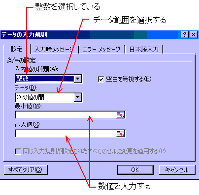 「整数」選択の次は、データ(D)の▼矢印をクリックして、データ範囲を選択します。(データ範囲の種類は、下図参照)