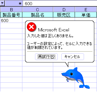 以上のように製品番号のセルへ入力規則を設定し、600番を入力しようとすると下図のようにエラーメッセージが表示されます。