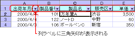 ※抽出された渋谷区のデータは、更に絞り込んで抽出する事ができます。たとえば製品名の▼矢印をクリック して万年筆Aを選択すると、渋谷区の万年筆Aのデータだけが表示されます。このように、次々と絞り込んでデータを抽出する事が可能です。 ※オートフィルタを実行後に再度すべてのデータを表示するには、リストボックスの一番上にある(すべて)を選択します。ただし、上記のように絞り込んでデータを抽出した場合は、それぞれのリストボックスで(すべて)を選択する必要があります。また、オートフィルタを解除するには、設定のときクリックしたメニューバーからオートフィルタ(F)を再度クリックします。(オートフィルタを設定するとチェックマークが付いています) トップテンオートフィルタ、オートフィルタオプションについては、下段参照。 |