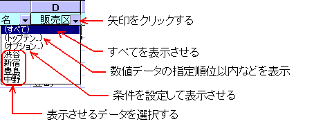 上段のリストボックスの解説図のとおり、ボックスに表示される(トップテン…)や(オプション…)を選択するとオートフィルタをより便利に使う事ができます。