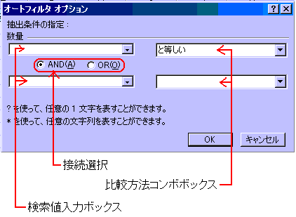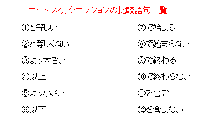 NZO30 KENZO30 KENZO30 ■オートフィルタオプションリストボックスの(オプション…)を選択すると、下図の「オートフィルタオプション」ダイアログボックスが表示されます。最大2つの条件で比較方法を設定してデータを抽出する事ができます。
