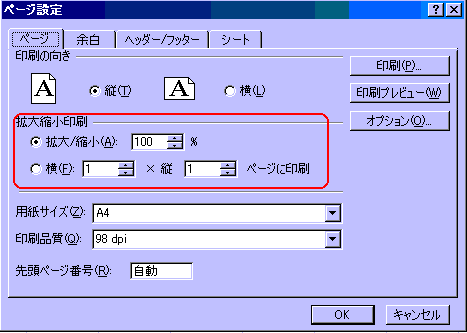 ■拡大/縮小印刷Excelには、拡大あるいは縮小して印刷する機能が用意されています。この拡大/縮小印刷は、「ページ設定」ダイアログボックスで行います。なお、下段の改ページプレビューで改ページ位置を変更しても拡大/縮小印刷になります。