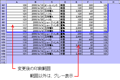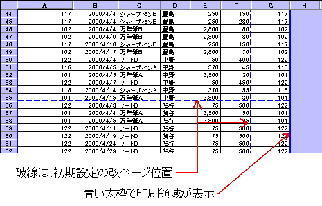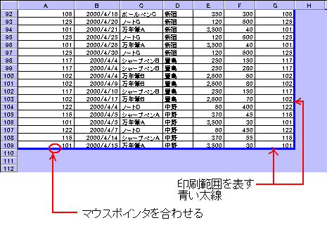 ■改ページプレビューによる印刷範囲の変更改ページプレビューでは、上記と同じ方法で、印刷範囲を変更する事ができます。