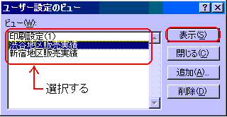 ◆ビューの表示保存したビューは、「ユーザー設定のビュー」ダイアログボックス内に表示されます。