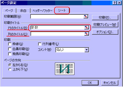 ■見出しの印刷◆印刷の設定方法見出しの設定は、「ページ設定」ダイアログボックスで簡単に行う事ができます。メニュバーのファイル(F)からページ設定(U)をクリックし、表示されたダイアログボックスで設定します。