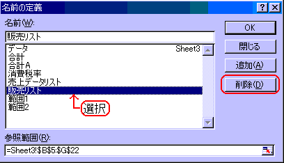 削除する場合も、シート単位の名前は、そのシート上で「名前の定義」ダイアログボックスを表示させて行います。