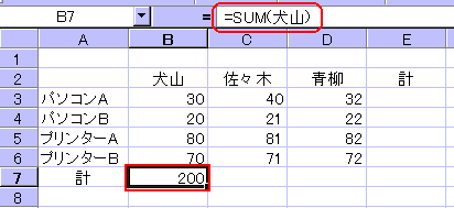 このように、行と列の見出しをラベル範囲として指定すれば、「=B3(マウスで選択)+D3(マウスで選択)」すれば自動的に「=犬山