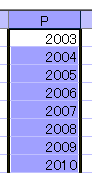 そのために、左図のように、案内シートの邪魔にならない位置へリストで表示させるためのデータを入力します。P1へ2003、P2へ2004と入力し、P1、P2を選択して、オートフィルで2099まで入力します。