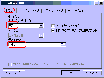 そして、入力値の種類(A)でリストを選択し、元の値(S)へ「=年リスト」と入力します。イコールは半角で入力します。 |