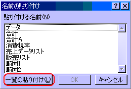次に、挿入(I)名前(N)から貼り付け(P)をクリックし、左図の「名前の貼り付けダイアログボックスを表示させ「一覧の貼り付け(L)」をクリックします。