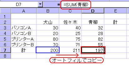 左図は、B7へ「=SUM(犬山)」としておいて、これをオートフィルでコピーしたものです。