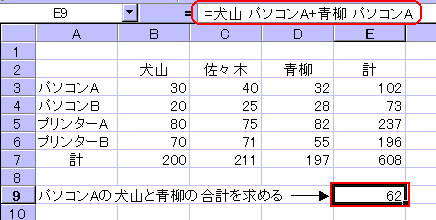 セル参照では、パソコンAの犬山と青柳の合計は「=B3+D3」ですが、左図では「=犬山 パソコンA