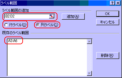 下図は、上図の列見出しをラベル範囲として設定途中のものです。図の既存のラベル範囲にはすでに「A3:A6」があり、行見出しがラベル範囲として設定されていることを表しています。