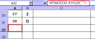 そこで、下図のようにA32へ「=IF(MOD(A1,4)=0,29,"")」と関数を入れます。