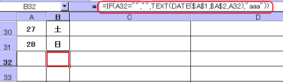 曜日を取得する関数は、これまで入力したもののままでは、A32が空白(閏年でない)の場合エラー値になります。そこで、以下のようにIF関数で処理します。A32セルが空白の場合は、空白を返すようにしたものです。「=IF(A32="","",TEXT(DATE($A$1,$A$2,A32),"aaa"))」