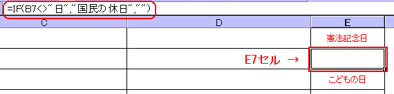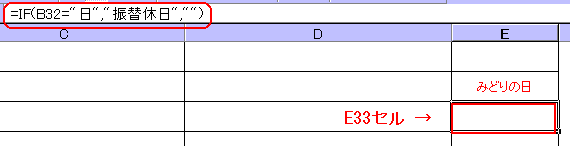 「=IF(A23=春分日,"春分の日",IF(AND(E22="春分の日",B22="日"),"振替休日",""))」と表すことができます。