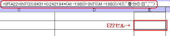 「=IF(A22=INT(20.8431+0.242194*(A1-1980)-INT((A1-1980)/4)),"春分の日","")」は、