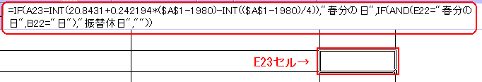 「=IF(A23=INT(20.8431+0.242194*($A$1-1980)-INT(($A$1-1980)/4)),"春分の日",IF(AND(E22="春分の日",B22="日"),"振替休日",""))」となります。(図の式は強制改行しています)