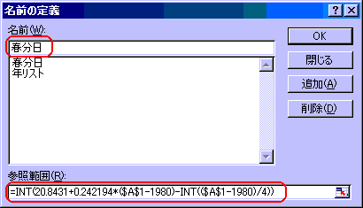 挿入(I)⇒名前(N)⇒定義(D)から左図の名前の定義ダイアログボックスへ、上記で解説した春分日を求める式を入力します。名前を「春分日」とします。 |