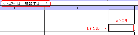 「=IF(AND(E27="秋分の日",B27="日"),"振替休日","")」となります。