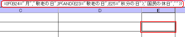 「=IF(B24="月","敬老の日",IF(AND(E23="敬老の日",E25="秋分の日"),"国民の休日",""))」