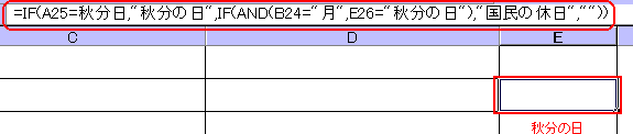 「=IF(A26=秋分日,"秋分の日",IF(AND(E25="秋分の日",B25="日"),"振替休日",""))」となります。