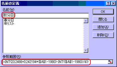 挿入(I)⇒名前(N)⇒定義(D)から左図の名前の定義ダイアログボックスへ、上記で解説した秋分日を求める式を入力します。名前を「秋分日」とします。