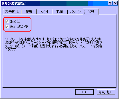 保護タブ内で、「ロック」と「表示しない」にチェックを入れます。