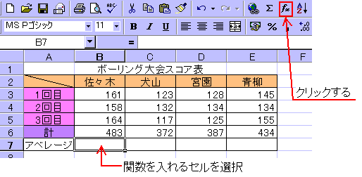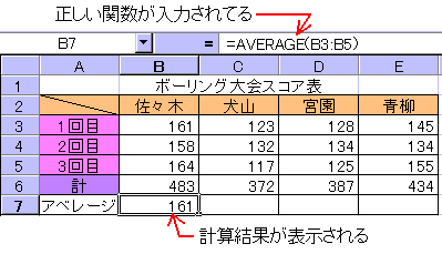 中級1で述べた「AVERAGE(アベレージ)」関数の入力例から入力方法を説明します。この関数は、名前のとおり数値データの平均値を算出する関数です。