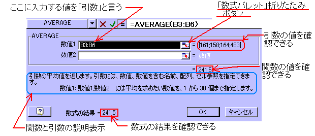 ■関数の貼り付け」ダイアログボックスからの入力関数を入力するには、「関数の貼り付けダイアログボックス」と「数式パレット」を使います。他にも方法(下段の基本(2)参照。)がありますが、初心者には、この方法が一番使いやすいかと思います。キボード操作に慣れていれば、下段のキーボードによる入力にチャレンジしてください。