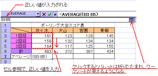 関数は、種類、入力する場所によって引数が自動的に入力されることがあります。(AVERAGE関数の引数は、入力する場所によって自動的に入力されます。図の例では、入力する場所がセル参照で入力する引数と同じ列内なので、自動的に入力されています。)