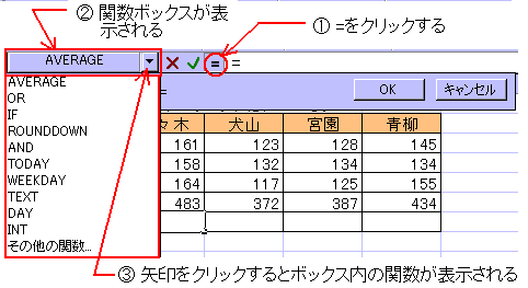 関数の入力は、上段の方法以外に「関数ボックス」から入力したりキーボードから直接入力することが出来ます。