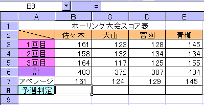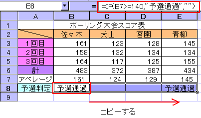 この関数式は、佐々木選手の予選通過の判定をするものですが、コピーして他の選手の判定にも使用します。式内のセル参照は、相対参照ですから通常のデータのコピーと同じ方法で行います。(コピー方法、参照形式は、初級1〜3参照。この場合、オートフィルによるコピーが手っ取り早い方法です。) ※表内に関数を入力するには、例のように一つだけ式を作って、コピーします。表によって、セルの参照形式をどうするか決める必要があります。セルの参照形式をしっかり覚えましょう。