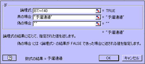 例は、アベレージ140以上は予選通過と表示させ、それ以下の場合は、何も表示させないように考えたものです。 論理式は、B7セルが140以上かどうかを判定(真か偽か)するもので、演算子の >= (〜以上)を使っています。入力方法は、論理式の入力ボックスへカーソルが入っている事を確認して、B7セルをクリックし、演算子(>=)と140を半角で入力します。入力ボックスの右側にTRUEと表示されるのは、B7セルが140以上である(真である。)事を意味しています。(演算子の詳細は、中級3参照。) 真の場合の入力ボックスへは、論理式の判定が真(TRUE)であった場合に返す値を入力します。例の場合は、文字列を返す式となっています。入力方法は、引数に文字列を入力するための「"」ダブル クォテーションで予選通過の文字を囲んで入力します。(ダブル クォテーションは半角で、文字は全角で入力。) 偽の場合の入力ボックスへは、論理式の判定が偽(FALSE)であった場合に返す値を入力します。例では、何も表示させない(空白で返す。)ようになっています。入力方法は、「"」ダブル クォテーションを半角で2つ入力します。ダブル クォテーションは、引数に文字列を使うためのものですが、これを2つ使う事で、空白を囲んでいる事になり、何も表示させない(空白で返す。)設定になります。よく使う技ですから覚えておきましょう。