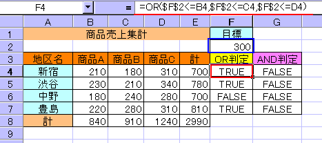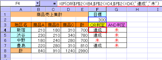 ◆使用例 1下図は、地区毎の商品売上をOR関数とAND関数で判定させたものです。OR関数では、商品A、B、Cの内どれかが目標値300をクリアしているかどうかを判定させ、AND関数では、商品A、B、Cのすべてが目標値300をクリアしているかどうかを判定させています。