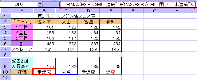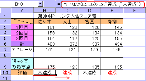 ■IFとMAX関数のネスト◆使用例 1下図のボーリング大会のデータで解説します。図のデータは、第3回目のものですが、過去2回の最高点と比較して、それをクリアしたかどうかを評価したものです。
