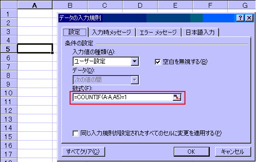 設定された、=COUNTIF(A:A,A5)=1の意味は、A列内を検索し、A5セルのデータと同じものの数を数え、それが1つであること(A5と同じものがないと言う意味。)を条件に入力できると言う設定です。