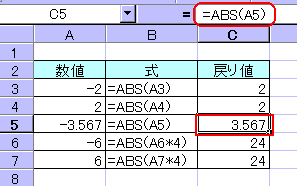 ■ABS関数ABS関数は、数値の絶対値を求める関数です。 書式で表すと、ABS(数値)となります。